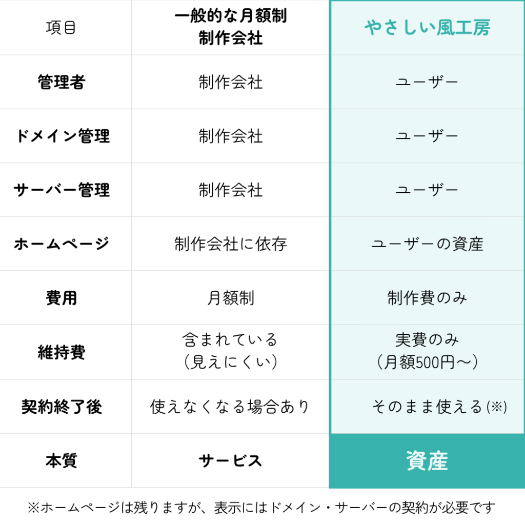 やさしい風工房では、初期費用ゼロ・管理費不要の買い切り型でホームページを制作しています。