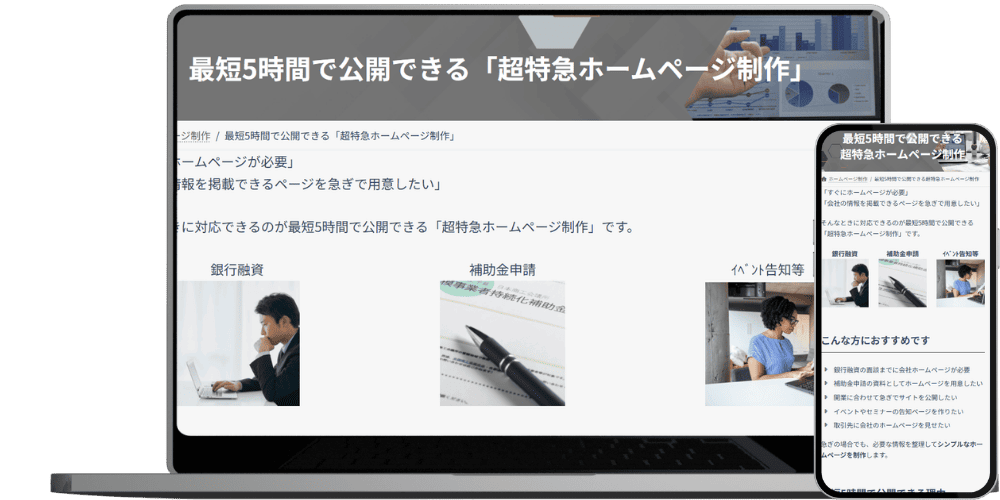 そんなときに対応できるのが最短5時間で公開できる「超特急ホームページ制作」です。